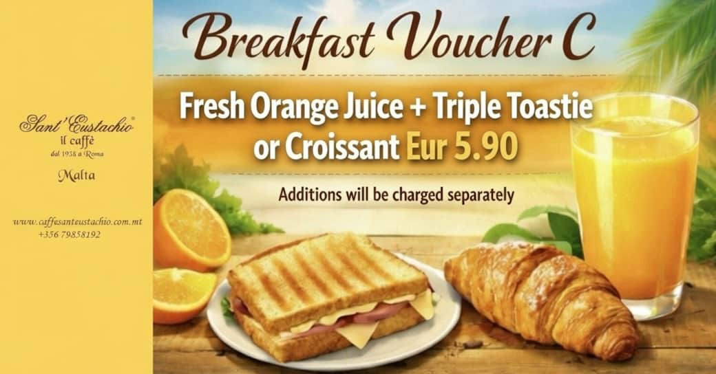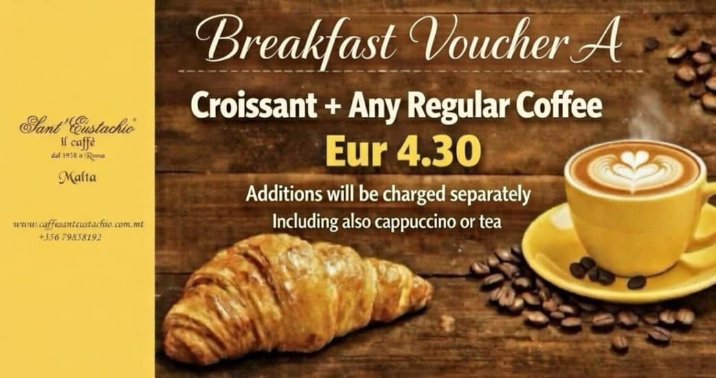 Breakfast vouchers are redeemable at Sant’ Eustachio il Caffè, Malta. Additions are charged separately.